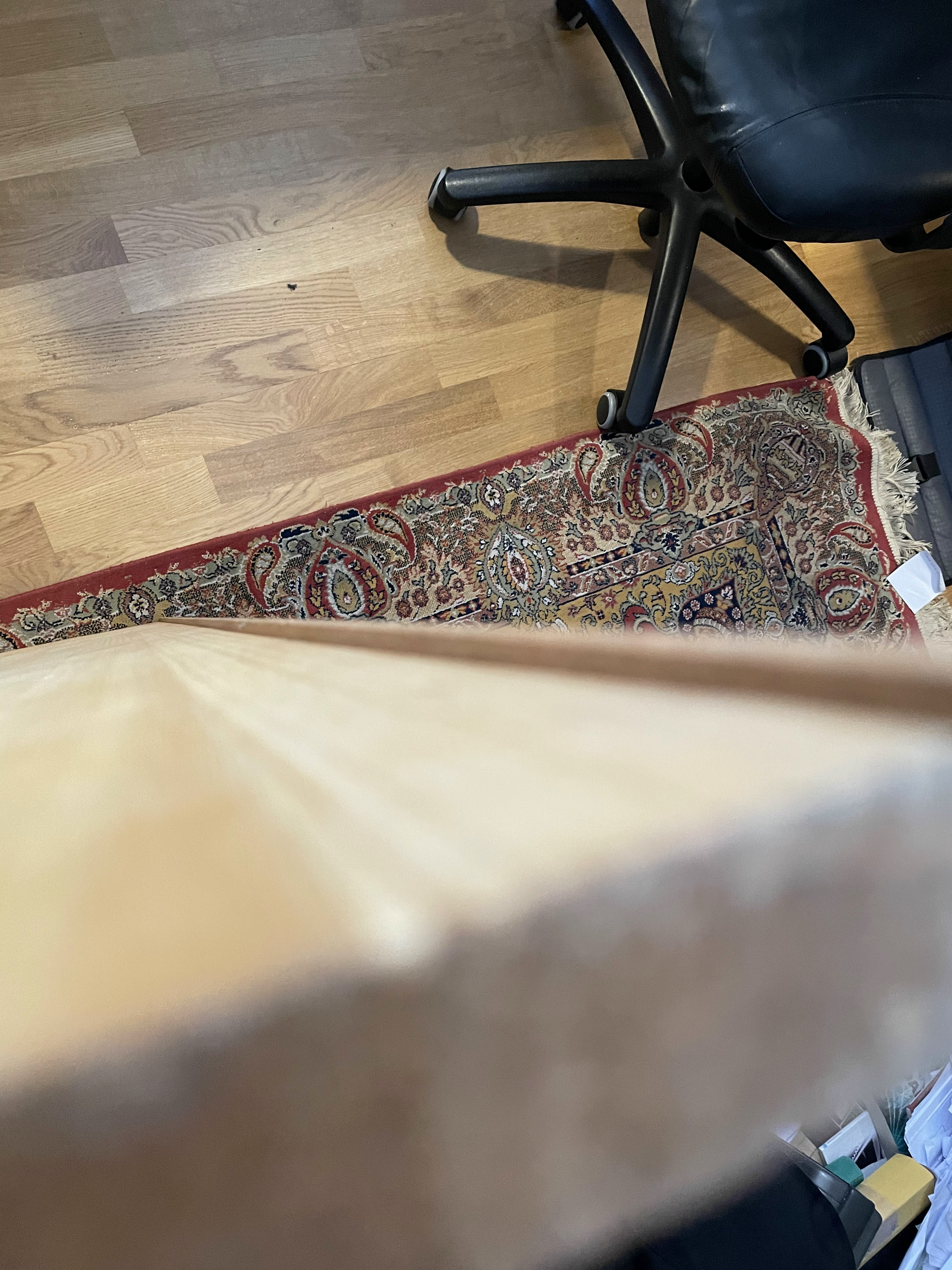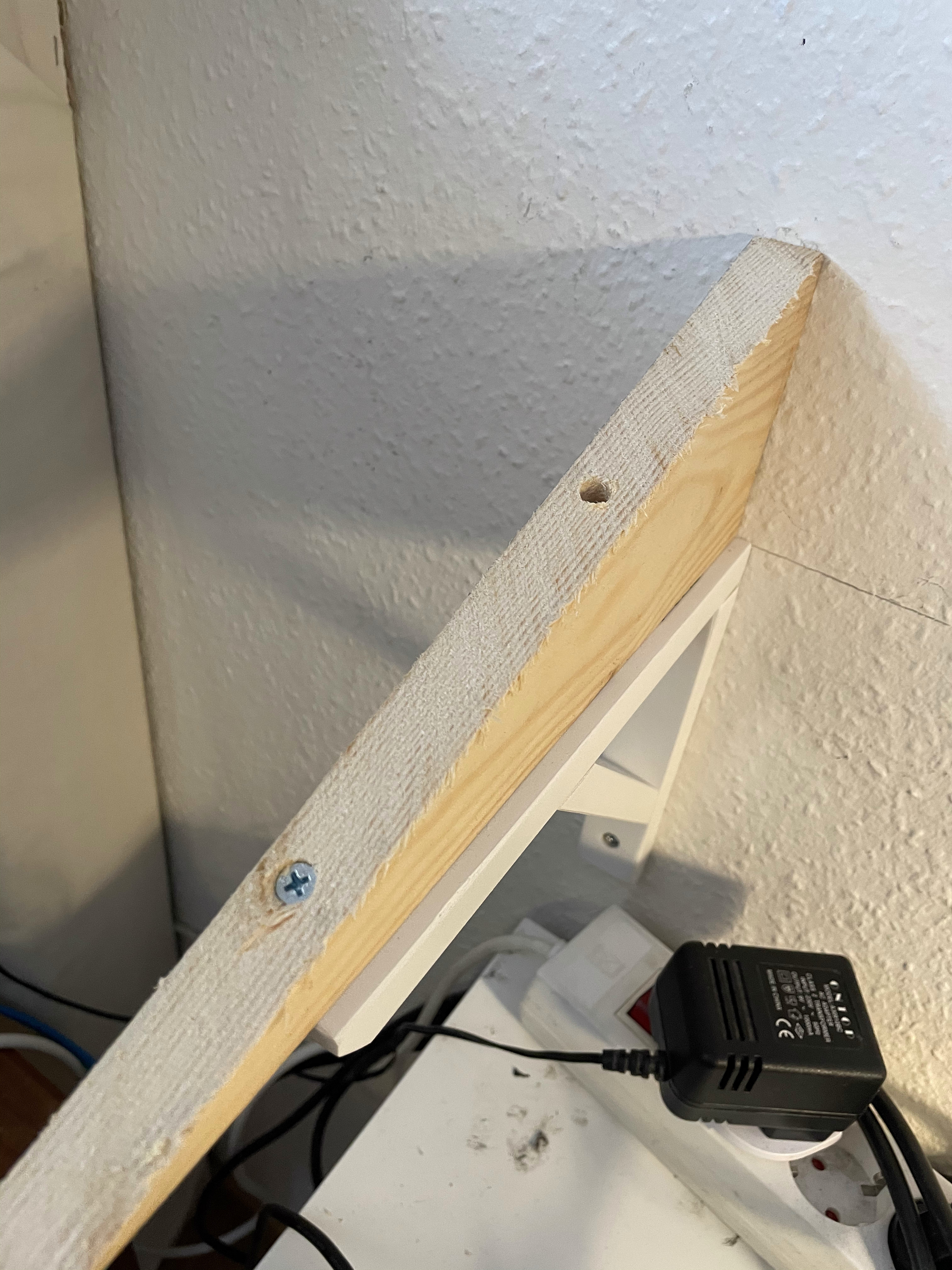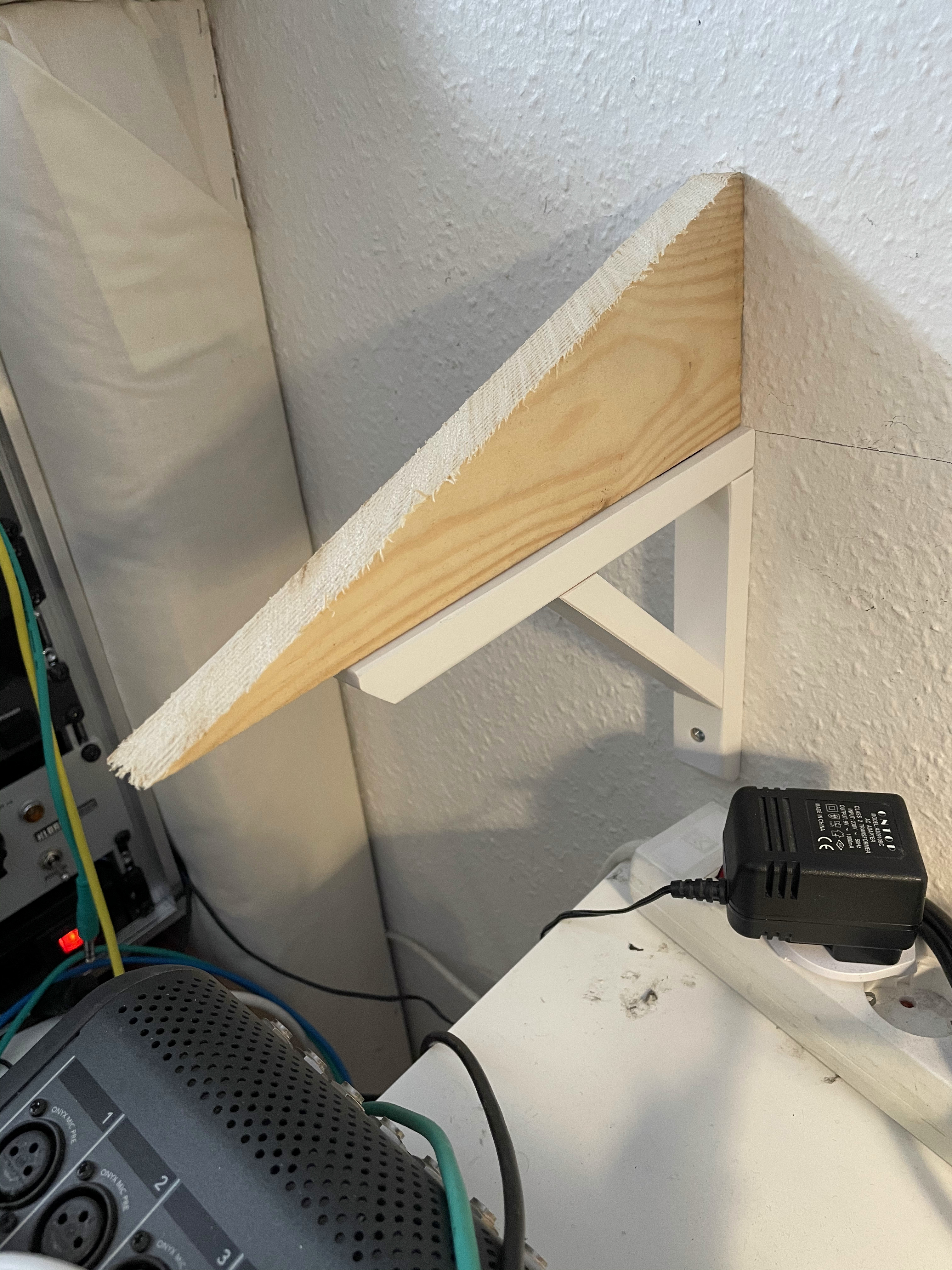 So, a shelf above the desk was needed. An angled shelf seemed the best for visibility and being able to see and control the gear there. I looked around for angled consoles, but I didn’t really find any. Or they were too expensive. So, in the meantime I put up a horisontal shelf like below. Didn’t really work.