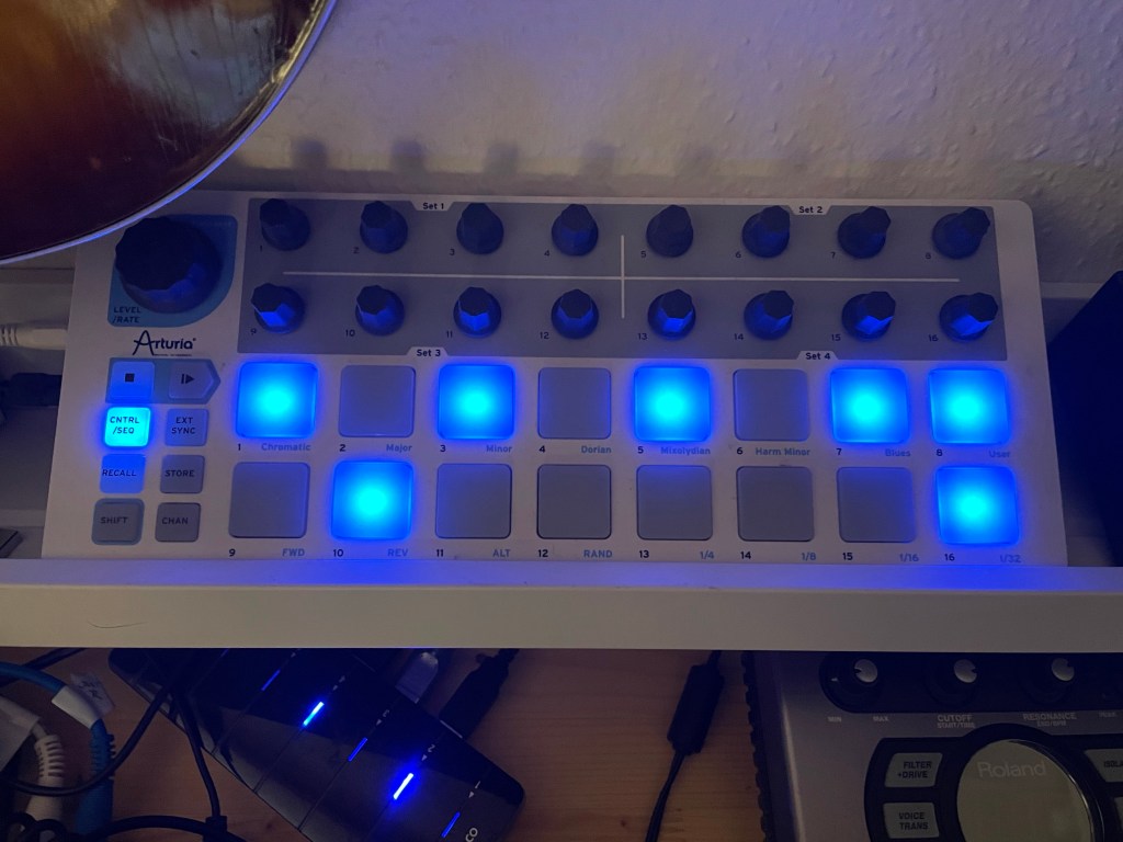 I added some drums, Minitaur-bass, rhodes with beat repeat and then there’s some “failed blowing” that I put a gate on and sidechained to the drums for percussive effect.